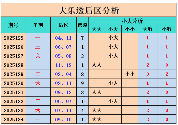 最近10期后区大小比为13:7,最近10期后区大大组合开出4期,小大组合开出5期,小小组合开出1期。上期开出大大组合,本期看好小大组合出现。