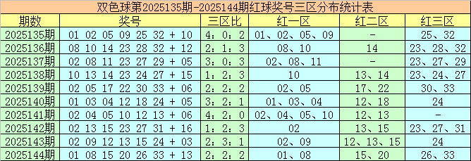 双色球第2025144期开出奖号为:01、08、15、20、26、33+13,其中红球三区比为2:2:2,蓝球开特殊数、大号、1路号码。