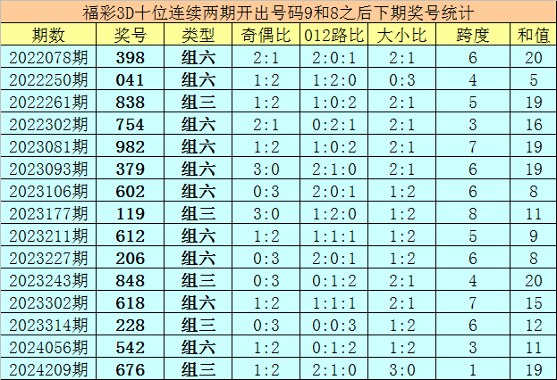 十位号码:前两期十位折柳出现奖号9-8,历史上福彩3D纠合前后折柳开出号码9-8的表象共开出89次。在十位9-8的表象出当前,最近15期其下期折柳开出号码:398-041-838-754-982-379-602-119-612-206-848-618-228-542-676;