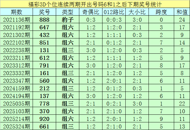 个位号码:最近两期个位开出号码为6-1,在福彩3D历史开奖中,前后两期个位折柳开出号码6-1的奖号出现了84次。最近15期个位6-1组合出现之后,其下期奖号折柳为:888-647-432-851-131-612-791-161-560-212-137-778-370-920-661;