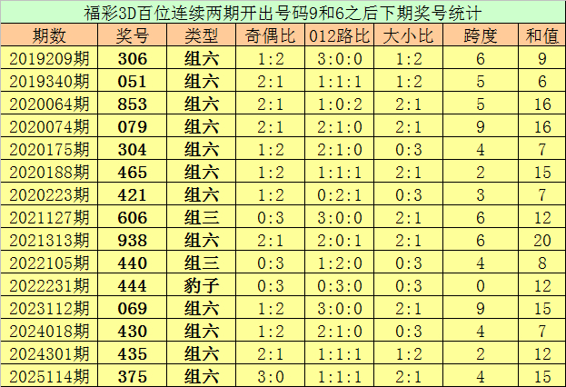 百位号码:纠合两期百位出号折柳为:9-6,历史上福彩3D纠合两期前后折柳出号9-6的奖号共出现83次。在百位9-6的奖号表象出当前,近15期下期折柳出号:306-051-853-079-304-465-421-606-938-440-444-069-430-435-375;